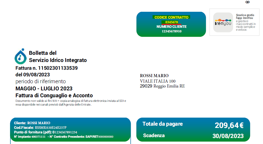 Prendi una tua bolletta e in alto a destra nel primo foglio troverai il tuo codice contratto, come evidenziato nell’immagine qui sotto.